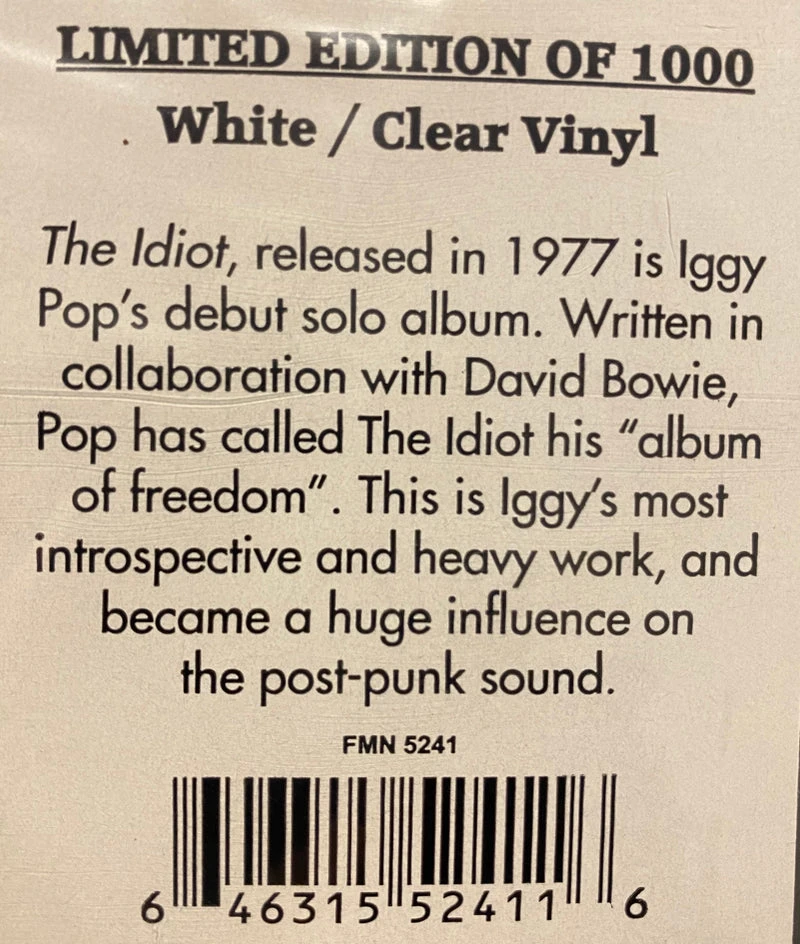 Famous Rock Shop/Vinyl Records Iggy Pop The Idiot Limited Edition White Clear Vinyl